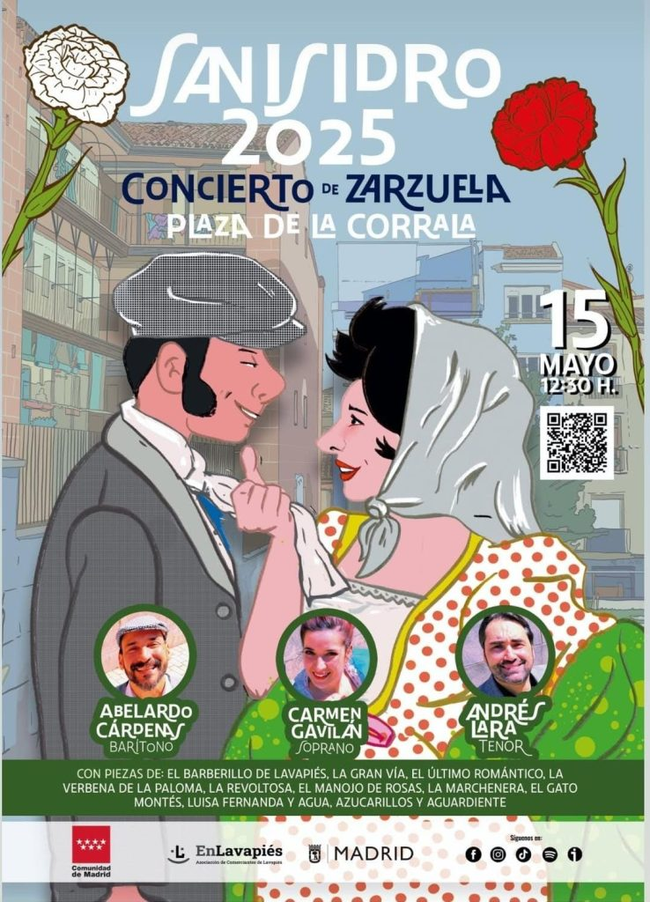 Por último, en la plaza de La Corrala, desde las 12:30 horas, se podrá disfrutar de una recopilación de piezas emblemáticas de zarzuela de temática madrileña y lavapiesera. Las interpretaciones correrán por cuenta de la soprano Carmen Gavilán, el tenor Andrés Lara y el barítono Abelardo Cárdenas. El concierto está organizado por la asociación de comerciantes de Lavapiés e incluido dentro del programa municipal de San Isidro.