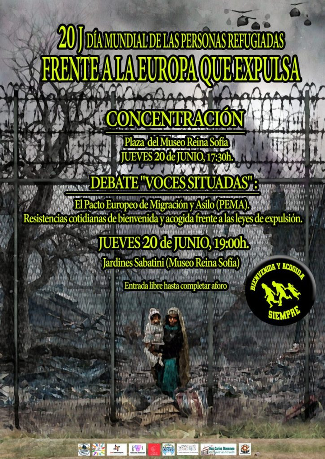 El jueves 20 de junio, con motivo de la celebración del Día Internacional de las Personas Refugiadas, distintos colectivos de la sociedad civil han convocado una concentración ante el museo Reina Sofía, en la plaza Juan Goytisolo, para rendir homenaje a las personas refugiadas y migrantes y «denunciar las nuevas medidas jurídicas adoptadas por el Consejo Europeo: la aprobación del nuevo Pacto Europeo de Migración y Asilo». Según estos grupos, este acuerdo «acrecentará la vulneración de derechos humanos y dificultará todavía más el derecho de las personas a solicitar asilo reconocido en la Convención de Ginebra de 1951».
