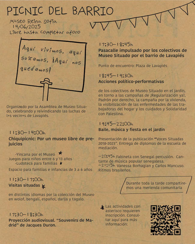 El sábado 14 de junio, la cita anual del Picnic del Barrio tomará, de nuevo, el Museo Reina Sofía. Se trata de una iniciativa que parte de la asamblea de la red Museo Situado, que reúne a distintos colectivos operativos en Lavapiés. El Picnic es, al mismo tiempo, una herramienta política y una celebración dentro del Reina Sofía, con actividades y recorridos por sus diferentes espacios.