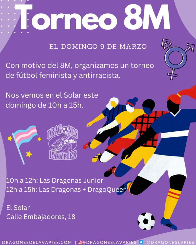 Dentro de la misma celebración local del 8M, Dragonas de Lavapiés ha organizado dos torneos deportivos feministas y antirracistas para la mañana del domingo, día 9.