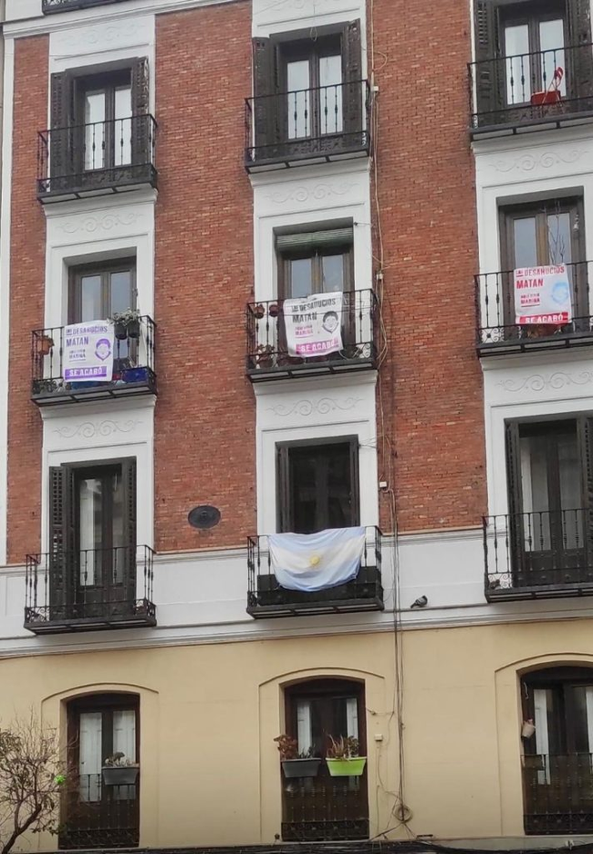Complementando la acción del viernes, se han producido y repartido más de 100 lonas que cuelgan ya de otros tantos balcones y espacios de la zona. En ellas se lee el siguiente mensaje junto al rostro de Marina López: «Los desahucios matan. Aquí vivió Marina. Se acabó«.