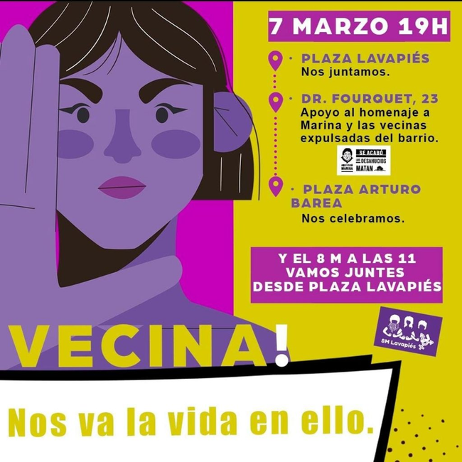 El día 8, a las 11, la Asamblea llama a salir juntas desde la plaza de Lavapiés hacia la gran manifestación que con motivo del Día Internacional de la Mujer partirá desde Atocha al mediodía bajo el lema ‘Feministas antirracistas ¡A las calles!’.