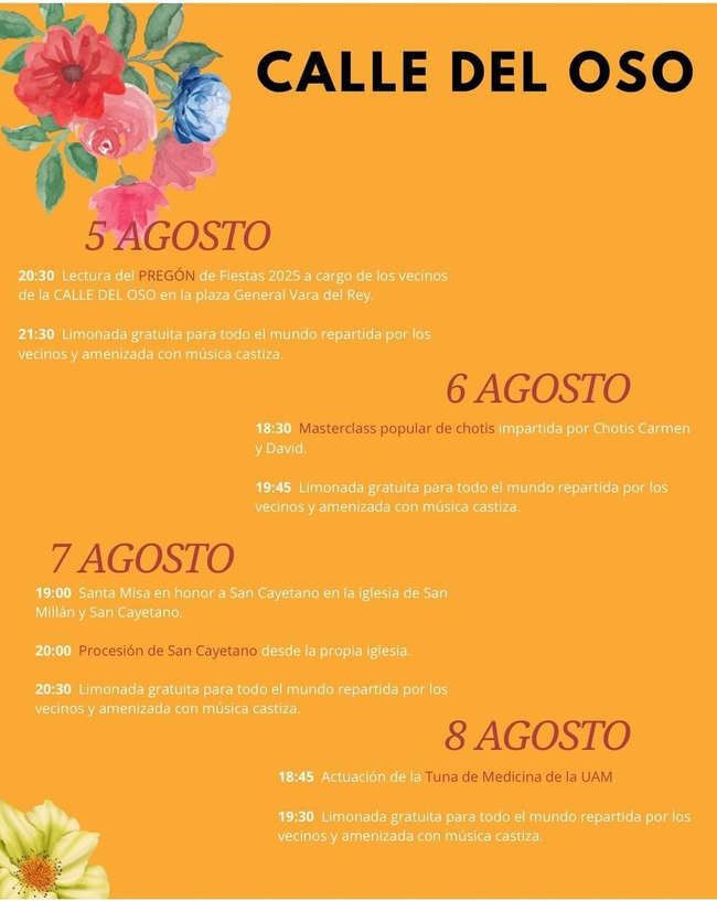 20.30 h – Pregón a cargo de vecinos de la calle del Oso. Plaza General Vara de Rey.