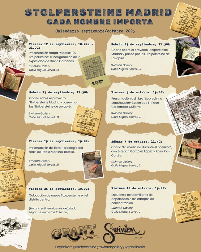 Del 12 de septiembre al 11 de octubre el proyecto Stolpersteine y su división madrileña se hace fuerte en Swinton Gallery y Grant Librería, donde la exposición 'Cada nombre importa, Stolpersteine en Madrid' mostrará las acuarelas que David Cárdenas ha dedicado a esta iniciativa, se presentará un mapa con los lugares de la ciudad donde están situadas estas piedras de la memoria, habrá charlas y presentaciones de libros al respecto, paseos guiados por las stolpersteine de Lavapiés y hasta un encuentro con familiares de españoles deportados a campos de exterminio nazis.