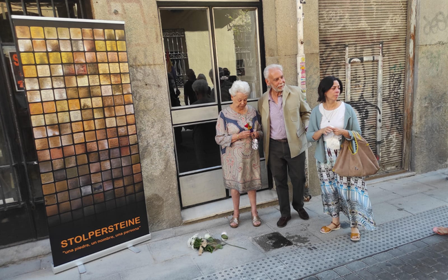 Imagen de archivo de familiares de un vecino deportado junto a la stolpersteine que lo recuerda delante de donde vivió | Foto: xlavapies.com