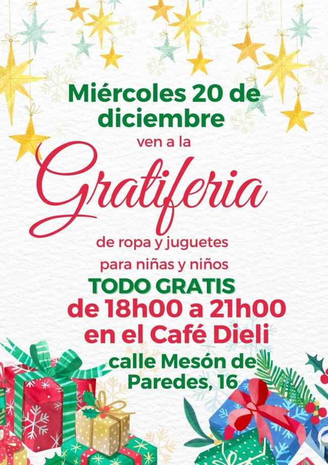 Las personas que necesiten alguna de la ropa o de los juguetes que han sido donados se pueden acercar este miércoles, de 18 a 21 horas, por el Café Dieli (Mesón de Paredes 16), que es donde tendrá lugar el mercadillo y, sin más, llevarse lo que gusten.