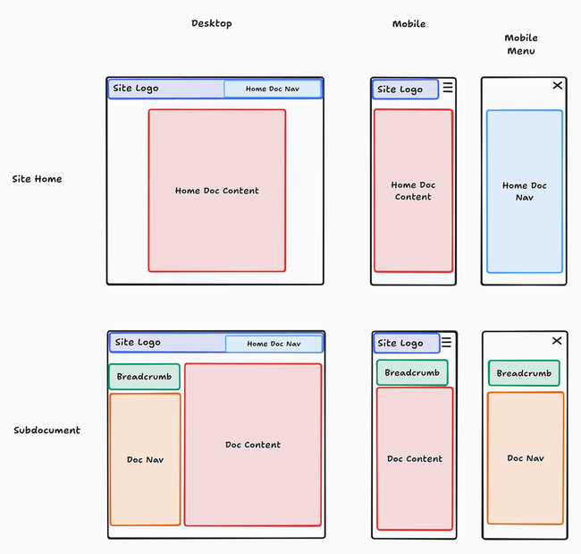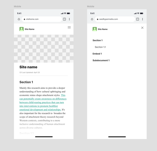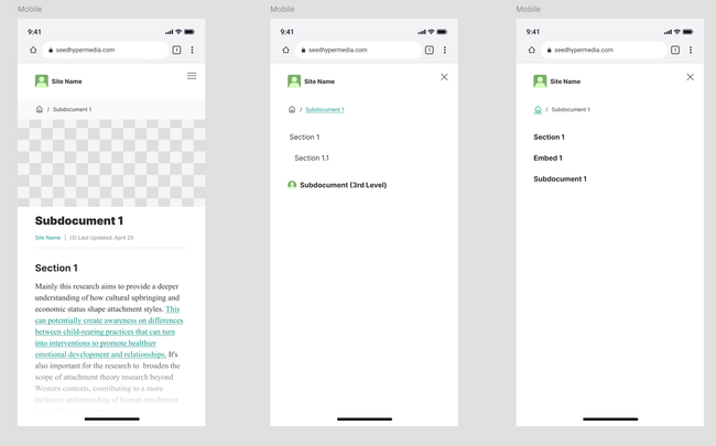 To support phone-sized screens, a Client should give easy access to the Navigation of the document. To ease navigation across the site, the navigation should have its own Breadcrumb that helps the user access the Navigation of Parent Documents and the Site Home.