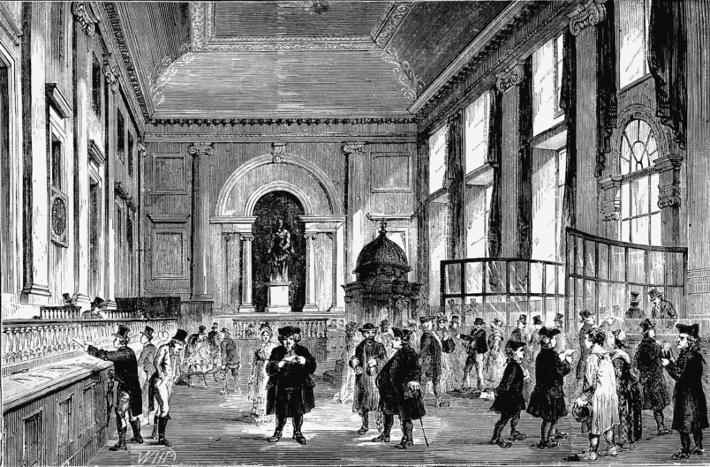 Esta empresa creada en 1746 para promover el comercio al mayor de tejido de lino empezó a proveedor servicios bancarios a sus clientes sin emisión de billetes (depósitos, créditos etc).
