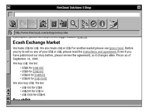 > Se ha demostrado por primera vez el pago desde cualquier ordenador personal a cualquier otra estación de trabajo, a través del correo electrónico o de Internet, utilizando la tecnología del dinero electrónico. "Se puede pagar el acceso a una base de datos, comprar un software o un boletín por correo electrónico, jugar a un juego de ordenador a través de la red, recibir los 5 dólares que te debe un amigo o simplemente pedir una pizza. Las posibilidades son realmente ilimitadas". [4]