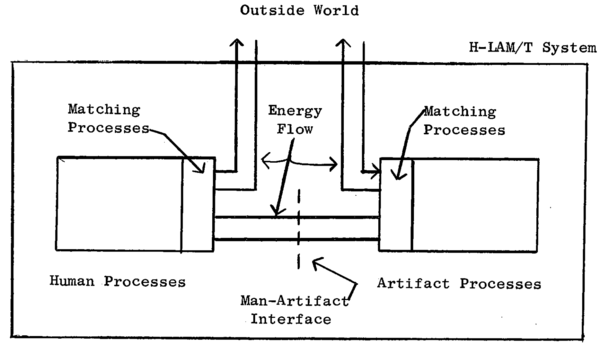 The outside world interacts with our H-LAM/T system by the exchange of energy with either the individual or his artifact. Again, special processes are often designed to accommodate this exchange. However, the direct concern of our present study lies within the system, with the internal processes that are and can be significantly involved in the effectiveness of the system in developing the human's comprehension and pursuing the human's goals.2c3d