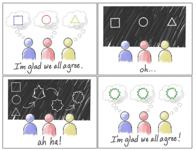It's not that one person is right or wrong, but that we all see different and important aspects. Through combining and refining our different ideas, we end up with a common understanding that includes all our best ideas. That's is why externalizing our ideas is so important. We can redraw sketches or move sticky notes around, and the cool thing is that we're really moving ideas around. What we're really doing is evolving our shared understanding. That's super-hard with just words alone.