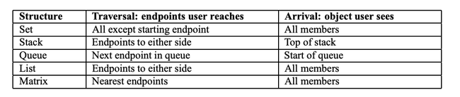 Traversal is the act of following a link [26]. At the moment a link is effectively a set, if it could have different internal structure then the behavior of the traversal could vary according to that structure. Arrival is the act of viewing a structure (for example at the end of a traversal). Here internal structure could effect the way in which members of the association are viewed. Table 1 shows some possible semantics for traversal and arrival over different structures.