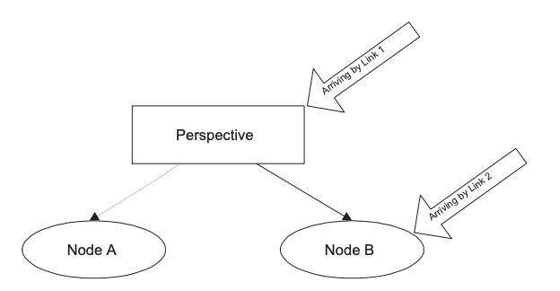 Modeling perspectives as associations has the interesting property of allowing users to move between the different views just as if you were following a link. It also provides a convenient way of choosing a view. For example, in Figure 6, arriving by link 2 takes you directly into a particular view, whereas arriving by link 1 takes you to the perspective itself, where the system (or the user) can decide which view to provide. These are very much the properties that are required by context in other hypertext systems.