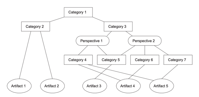 Whenever a taxonomy splits via perspectives the same artifacts can be reached down each branch, it is merely their categorization that changes.