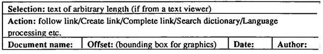 We conducted various experiments using the ACTOR version of Microcosm, and found that so long as a reasonably fast database is used to store the links, it is not unreasonable to search the entire database for links that are specific to the document at load time, and then to search the document file for the positions at which the visual clue should be inserted. However, inserting clues for links with a greater degree of generality is a problem. Clearly it is not reasonable to attempt to match every generic link in the database into the file, if the number of links is very large. Neither is it reasonable, if the file is very large, to attempt to match every possible text string in the file against the database. We found that the most acceptable solution to this problem was to allow the user to select an area of interest, and to select a menu option to match all possible strings in the selection against the database, and to display any matches found.