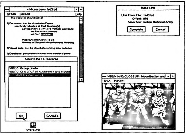 The first full implementation of Microcosm in MS Windows was ready for application development in January 1990. Our first application has been in the area of history and in particular in the development of an electronic version of the Mountbatten Archive. This archive is kept and maintained by the Hartley Library at the University of Southampton, and contains approximately 250,000 text documents, 50,000 photographs, 35 reels of cine film, and various audio and video tapes from the collection of the late Lord Mountbatten of Burma. The challenge is to make this archive available to historians in a way that permits explicit and implicit relationships between the different elements of the archive (text, photographs, film etc.) to be stored and analysed. Together with other colleagues at the University we have created a prototype of the electronic archive, taking documents and photographs from the period 1947-8, when Mountbatten was Viceroy of India. Currently, the text documents are stored as ASCII files on the hard-disc and the photographs are stored on a laser videodisc. Images from the latter are displayed in windows on the VGA screen of the computer workstation via a VideoLogic DVA-4000 board. This application provided the content of Figures i, and has allowed us to explore the potential of the various features that are built into Microcosm. A fuller report of this application and our work with the Department of History at Southampton is given in [Colson & Hall 1990].