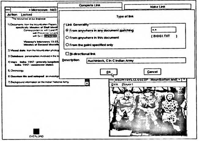 We are extremely grateful to colleagues in the Department of History HiDES project, the Archives and Manuscripts Department of the Hartley Library, and the Department of Teaching Media for their invaluable support and assistance in the application of Microcosm to the Mountbatten Archive.Thanks are also due to colleagues in the Department of Electronics and Computer Science who contributed so much to the early discussions on the design of Microcosm.
