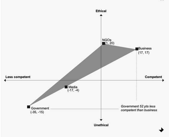 When people are not sure what information is true, they do not know what institutions they can trust. This is evident in the results of the 2024 Edelman Trust Barometer, which reports that businesses are seen as the only trustworthy institution. This study links trust to competence and ethics, and it found that government is seen as far less competent and ethical than business. It was ranked as 52 points less competent and 32 points less ethical. This is in line with other studies on this topic, such as one conducted by the Pew Research Center which found that “only 17% of Americans trust officials in power in Washington to do the right thing” (Pew cited by Eddy in the NYT, 2023).