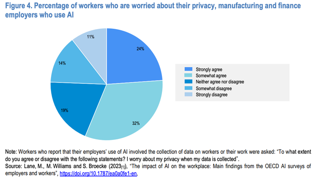 Privacy concerns regarding AI can also be found in the workplace. A survey that the OECD directed at both workers and employers found that when AI is used in the workplace, and workers’ data is used to train the machines, workers are concerned for their privacy. This concern could be related to the nature of the data that is being collected, which may or may not be personal, but also to an increase in monitoring and surveillance in the workplace.