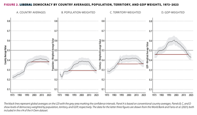 It is true that the global averages could be weighed down by some specific nondemocratic countries. However, in the increasingly globalized landscape we are living in, countries are now more economically interdependent than ever. According to the Wall Street Journal, the initiative of “change through trade”, which aimed to increase shared values through international trade, actually benefited countries such as China and Russia, and allowed them to become even more “radical and undemocratic”, while making western democracies more economically dependent on these nondemocratic countries (Dopfner, 2023).