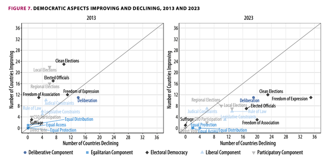 Democracy can be measured by different factors, such as fair elections, freedom of expression, and deliberation. The graph below from the V-Dem report shows an increase of countries declining in respect to these factors compared to those improving. Out of all of the factors, “deliberation is the only component worsening in both panels. It is declining in 19 countries in 2023, compared to 14 in 2013, while improving in eleven countries both in 2013 and 2023. The deliberative component measures respect for opposition, pluralism, and counterarguments with several different indicators and is central to the democratic process”.