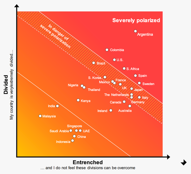 The increasing polarization is seen in indicators such as the one that found that 53% of respondents believe their country is more divided than it was in the past. The report ranked the different levels of polarization in different countries based on two indicators: being divided and entrenched. A “severely polarized” country is therefore one that is severely divided, with the perception that these divisions cannot be overcome. Spain is one of only 6 countries ranked as “severely polarized”, along with Argentina, Colombia, the US, South Africa and Sweden.