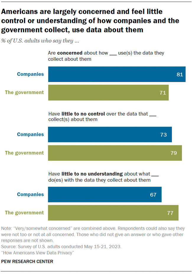 Although they do not understand how their data is being used, it is still a matter of concern to most Americans. The Pew survey found that in 2023, 71% were concerned about how the government uses citizens’ personal data, compared to 64% in 2019. However, more (81%) are concerned about how companies use their personal data. This figure has increased from 79% expressing concern in 2019.  This concern was also evident in a 2023 Deloitte report that showed that 67% of smartphone users worry about data security and privacy on their phones, which is up 13% from 2022.