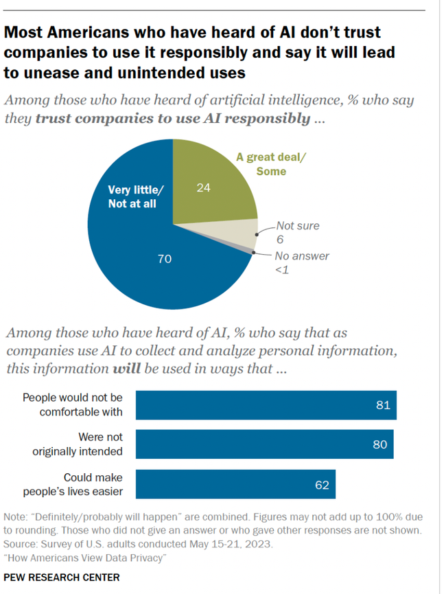 Privacy concerns go beyond data being collected online by companies or the government, and has to do with the emergence of AI as well. The development of AI requires data to be fed to its machine-learning algorithms, which raises concerns regarding the management of this data. “Where is this data coming from? Where is this data stored? Who can access it? And under what circumstances? These are questions that traditional data protection laws are not equipped to answer” (Reuters, 2023). A study from Brookings states that “As artificial intelligence evolves, it magnifies the ability to use personal information in ways that can intrude on privacy interests by raising analysis of personal information to new levels of power and speed”. These factors lead to a sense of distrust with regards to the development of AI.