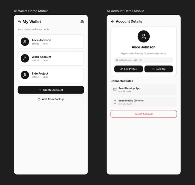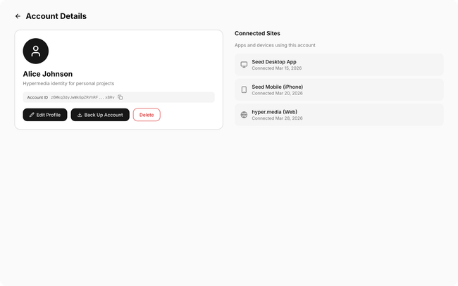 Account detail: Two-column layout — profile card on the left (name, description, Account ID, actions), connected sites list on the right. Actions: Edit Profile, Back Up Account, Delete.