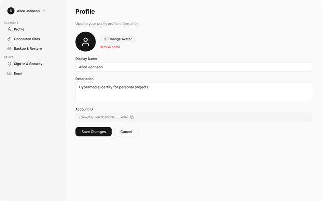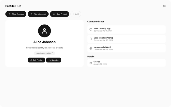 Connected sites are always visible alongside the profile, showing the relationship between identity and where it's used