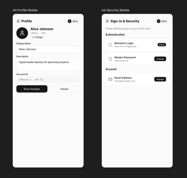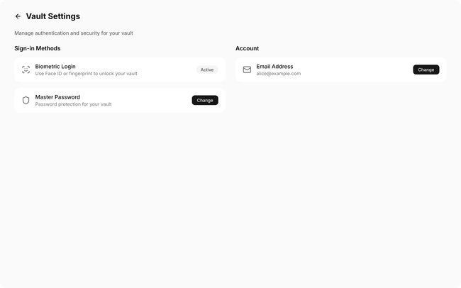 Right: Vault Settings panel — Biometric Login and Master Password as toggle rows, plus Account Email below.