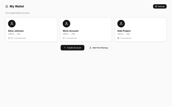 Home screen: Card grid showing all accounts. Each card displays avatar, name, truncated Account ID, and connected sites count. "Settings" button in the header opens vault-level settings (biometric, password, email).