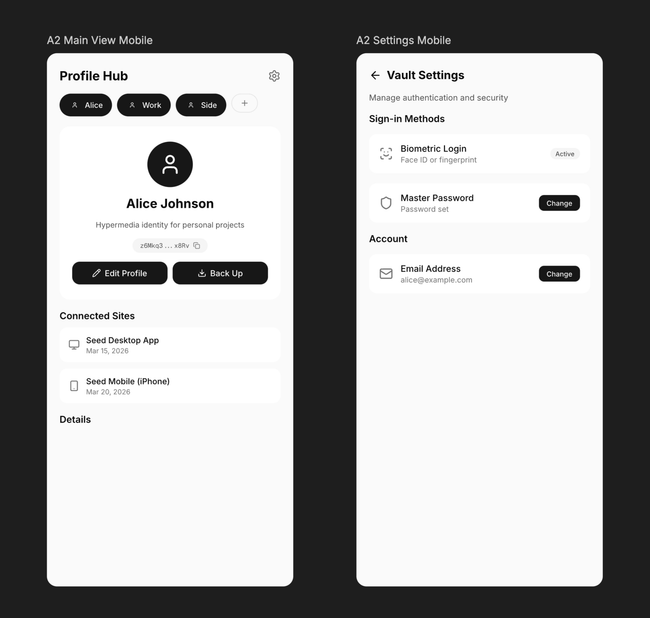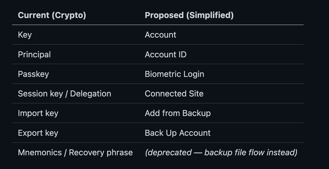 The current vault settings UI exposes cryptographic terminology (keys, principals, mnemonics, delegations) that confuses normal users. We need to redesign the vault settings screens with fully simplified language and intuitive metaphors that feel familiar to mainstream users.