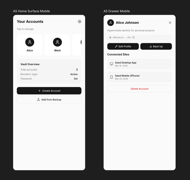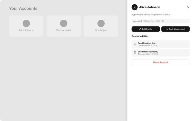 Account drawer: Slide-over panel from the right showing full account detail — name, description, Account ID, Edit Profile and Back Up buttons, connected sites list, Delete Account at bottom. Background dims to show layering.