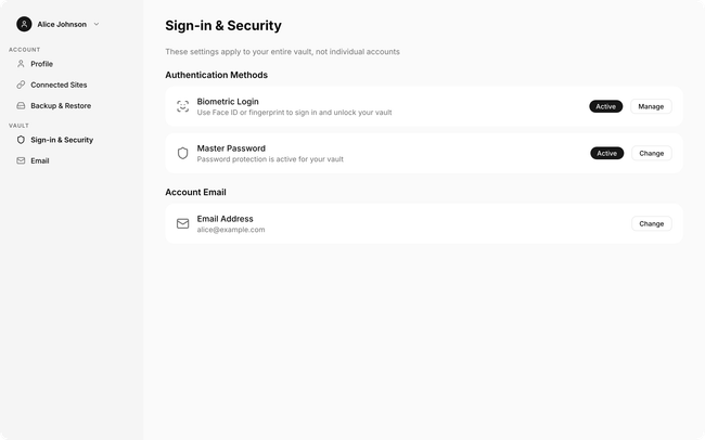 Sign-in & Security: Biometric Login + Master Password rows with Active badges and Manage/Change actions, plus Email Address row