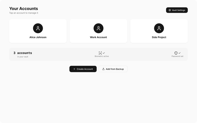 Home surface: Account tiles in a relaxed grid (avatar + name), a summary card showing "3 accounts in your vault" plus vault security status (biometric active, password set). "Vault Settings" button in header. Create Account and Add from Backup buttons below.
