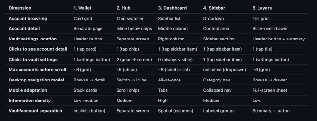 The three-column layout creates clear visual separation between the "what" (accounts list), the "who" (account detail), and the "how" (vault security)