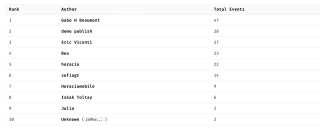 Two new contributors entered the top 10: sofiagr (14 events) and demo publish (28 events).