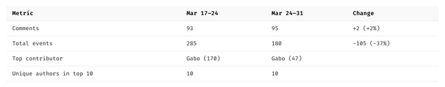 Comment activity remained steady at 95, nearly identical to the previous week.