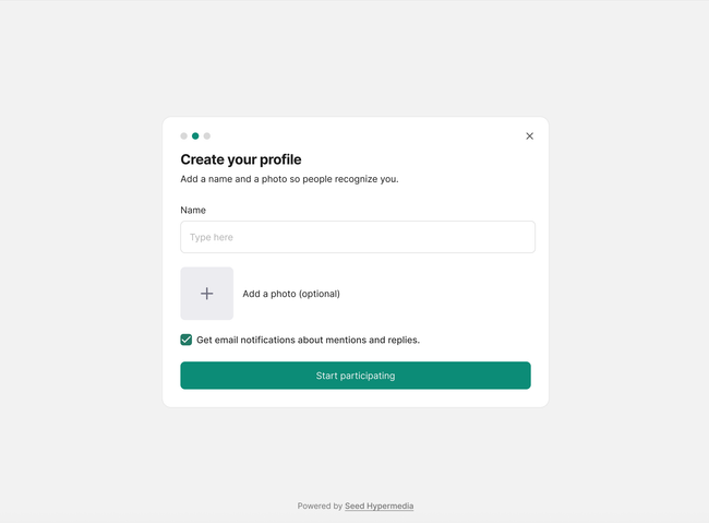 We facilitate the experience with clear copy text to set up expectations. Title is centered in the value not in the action (Join the conversation not create an account)