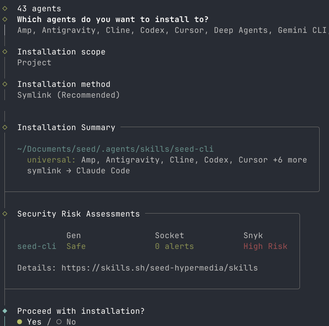 Confirm the installation. The skill is now available in your agent. In Claude Code, you can invoke it with /seed-cli.