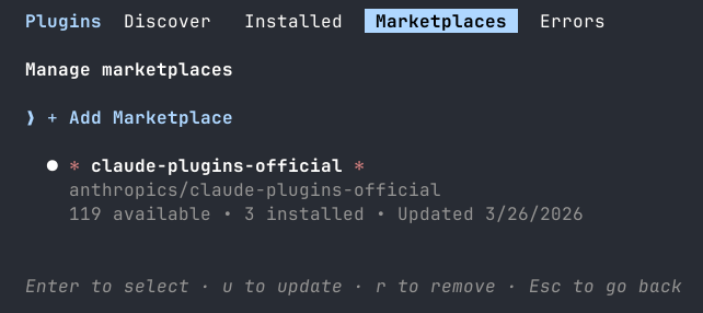 Open the plugin manager in Claude Code with /plugin, navigate to the Marketplaces tab, and select + Add Marketplace: