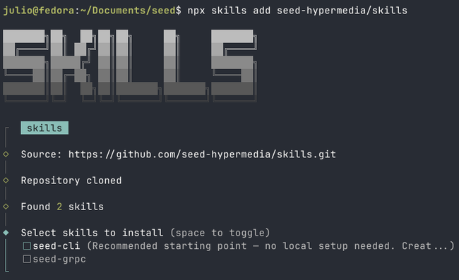 Select seed-cli (recommended starting point) and any other skills you need using the space bar: