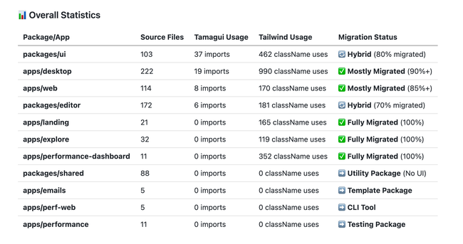 The frontend codebase is currently in a hybrid state with significant progress toward Tailwind CSS migration. Based on analysis of 784 source files across 11 packages/apps, approximately 75-80% of the UI layer has been migrated from Tamagui to Tailwind CSS.