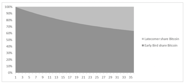 In the example below, we assume for the sake of simplicity that the crowding out goes exclusively at the expense of other consumers. A scenario in which also investments are impacted requires more comprehensive modelling to be meaningful. In any case, it is not a scenario that seems more attractive than the one examined below in which total consumption and investments each stay the same: lower investments mean lower growth which also eventually impacts negatively on the welfare of the nonBitcoin owners and latecomers (in addition to the direct crowding out of the consumption). A further simplifying assumption in the illustration below is to only have two subsets of the population each of which is internally homogeneous with regards to their Bitcoin holdings: Early Birds (who have Bitcoin