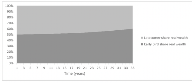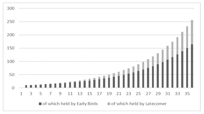 Figures 7 and 8 show that the Latecomers have a growing share of Bitcoin and ultimately the Bitcoin distribution converges to equality across the entire population. When equality is close, Bitcoin will no longer trigger any material fresh distributional consequences, i.e. it will have become neutral. However, when this stage is reached, (i) the Early Birds had benefitted for years from higher consumption levels; (ii) they will continue enjoying higher consumption as a result of their higher share in the capital stock.