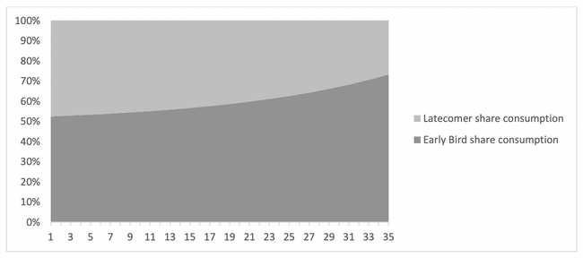 Finally, Figure 9 illustrates the Early Birds increasing share in consumption, necessarily at the expense of the Latecomers.